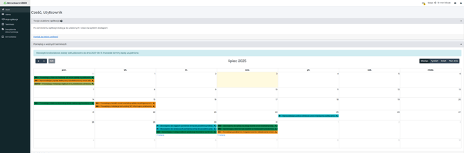 W prawym górnym rogu znajdziesz ikony powiadomień, alertów, informację o czasie sesji oraz ustawienia konta. Poniżej znajduje się panel użytkownika – widoczne są tam aplikacje oznaczone jako ulubione oraz terminarz z aktualnymi obowiązkami środowiskowymi.