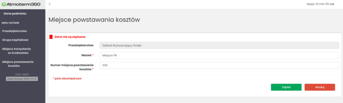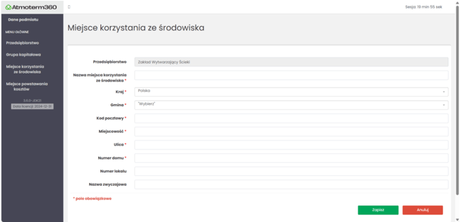 Na początku uzupełnij dane podmiotu, miejsca korzystania ze środowiska i dodaj pozwolenia. Te informacje będą wykorzystywane przy generowaniu raportów w poszczególnych aplikacjach, dlatego warto je wprowadzić od razu.