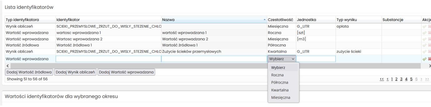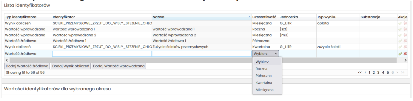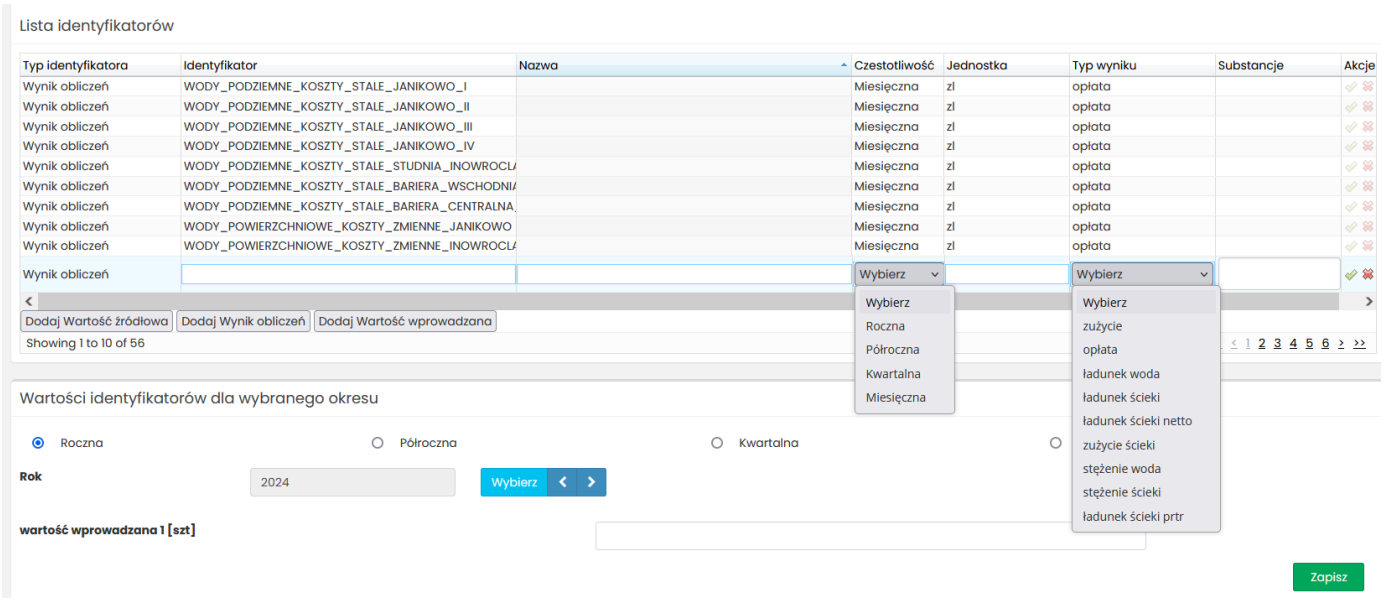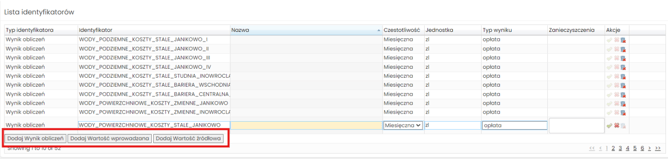 Aby dodać nowy wpis w tabeli określ jakie dane chcesz pozyskać i wybierz odpowiedni przycisk pod tabelą: „Dodaj Wartość źródłowa”, „Dodaj Wynik obliczeń”, „Dodaj Wartość wprowadzana”.