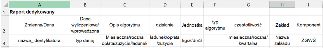 • Kolumna D „Działanie” – opisuje, czego dotyczy algorytm/dana źródłowa. Może być to ładunek, ilość wody/ścieków, opłata, itp.