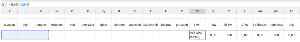 Arkusz dzieli się na dwie części – dane identyfikujące (kolumny A-I) oraz dane liczbowe eksportowane z aplikacji (kolumny K-AC). W pierwszej części wprowadź informacje pozwalające zidentyfikować dane w odpowiednich kolumnach: