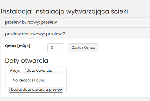 Dane o przelewach burzowych i deszczowych wprowadzane są w osobnej zakładce w menu po lewej stronie.