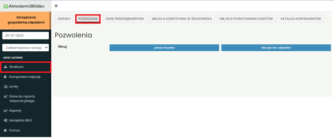Kliknij „Pozwolenia”, aby zobaczyć listę dodanych decyzji.