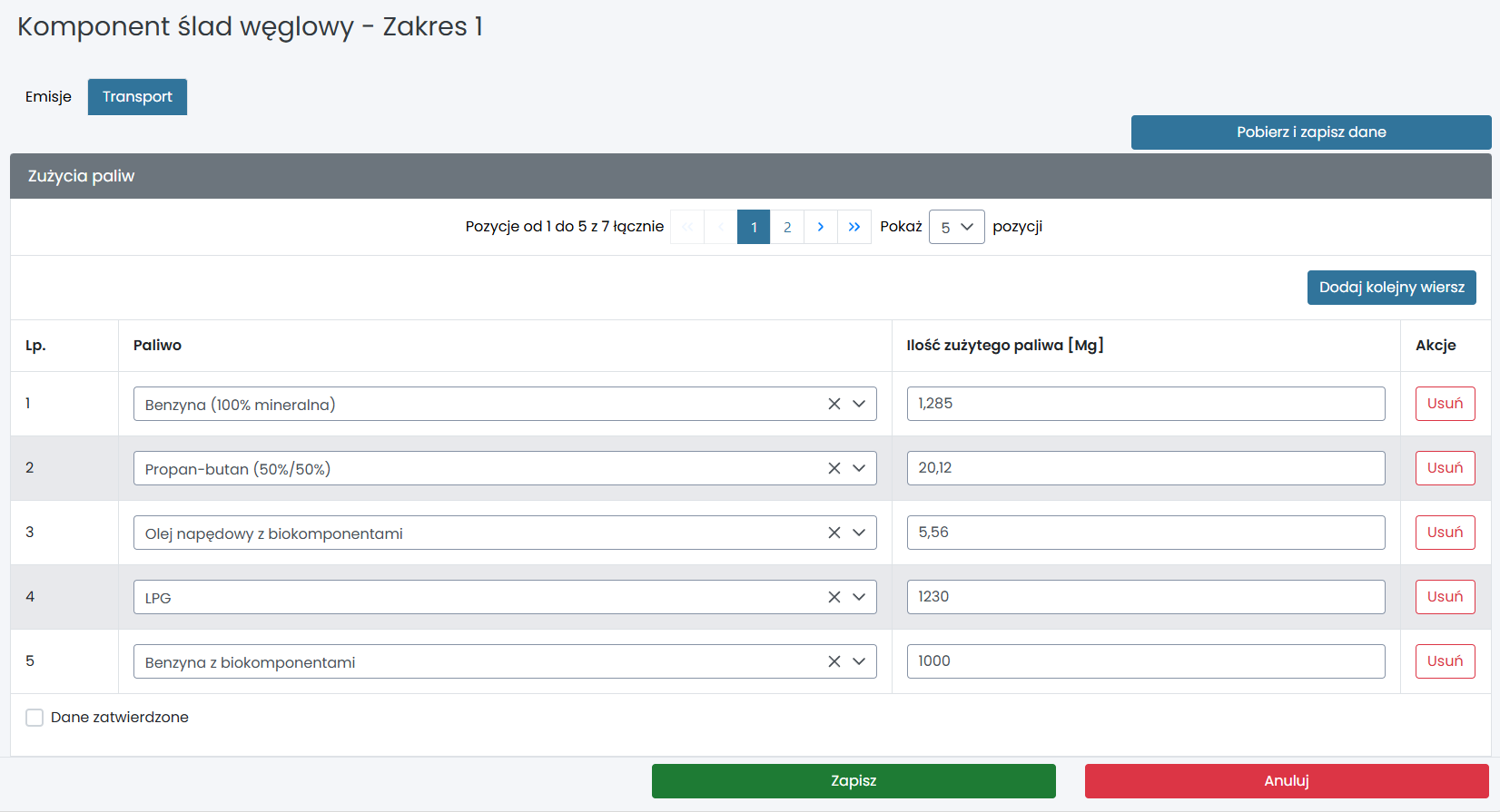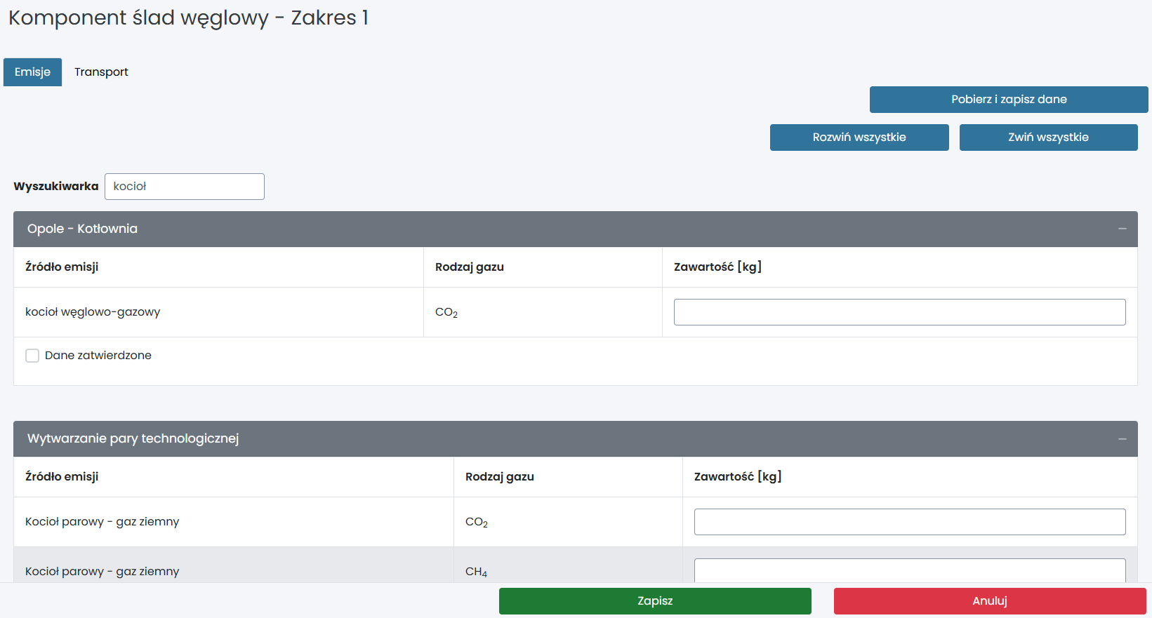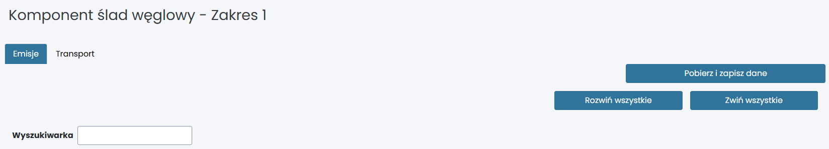 Strona „Komponent ślad węglowy – Zakres 1” składa się z dwóch zakładek: “Emisje” oraz “Transport”.