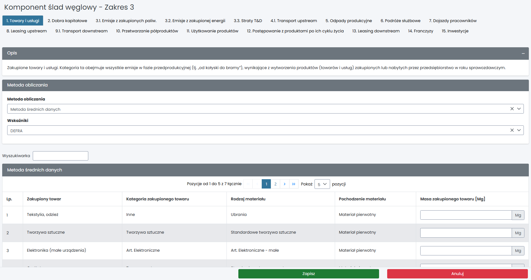 Na stronie „Komponent ślad węglowy – Zakres 3” możesz wprowadzać dane ilościowe w ramach poszczególnych kategorii. Widoczne są tylko te kategorie, które zostały wcześniej wybrane w strukturze.