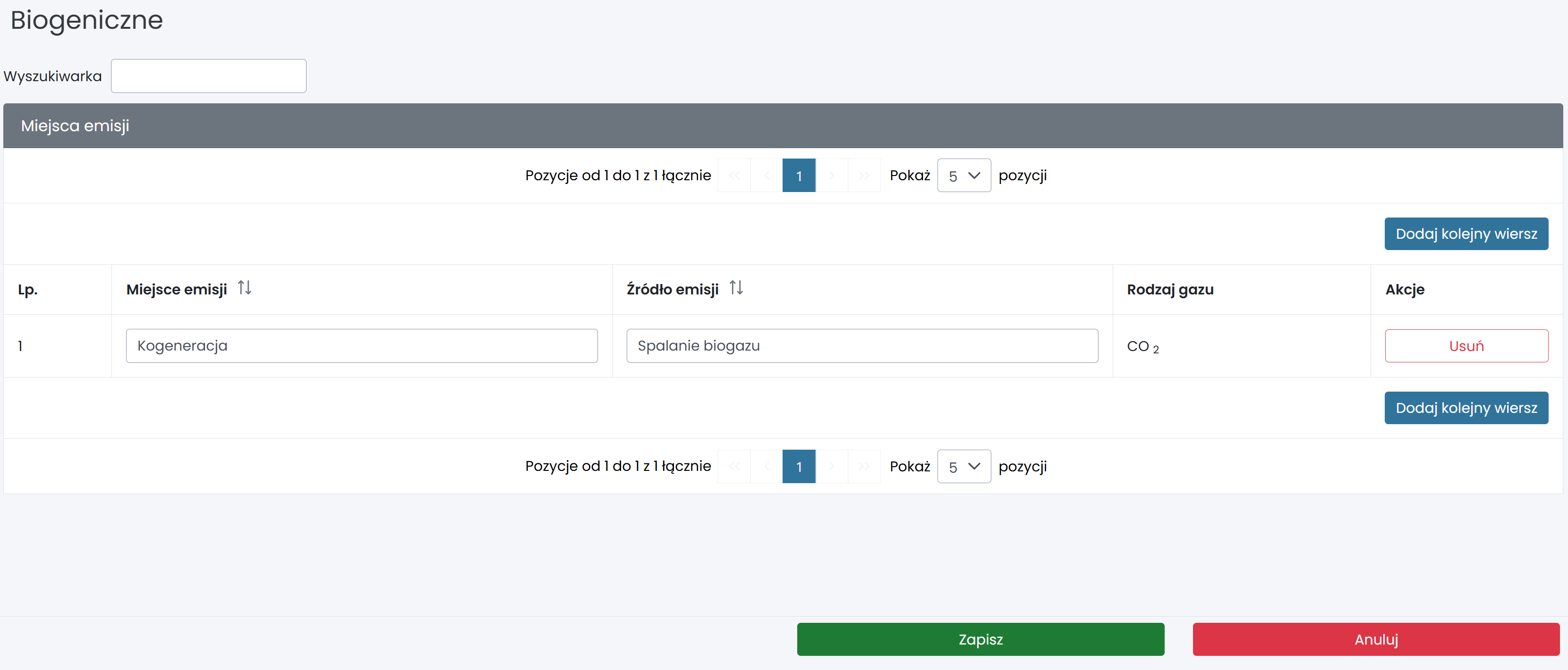 W celu dodania miejsca emisji poprzez formularz kliknij przycisk „Dodaj kolejny wiersz”. W tabeli zostanie dodany pusty wiersz z dwoma komórkami, w których określisz nazwę miejsca emisji oraz nazwę źródła emisji. Dokonane zmiany możesz zatwierdzić klikając przycisk „Zapisz”