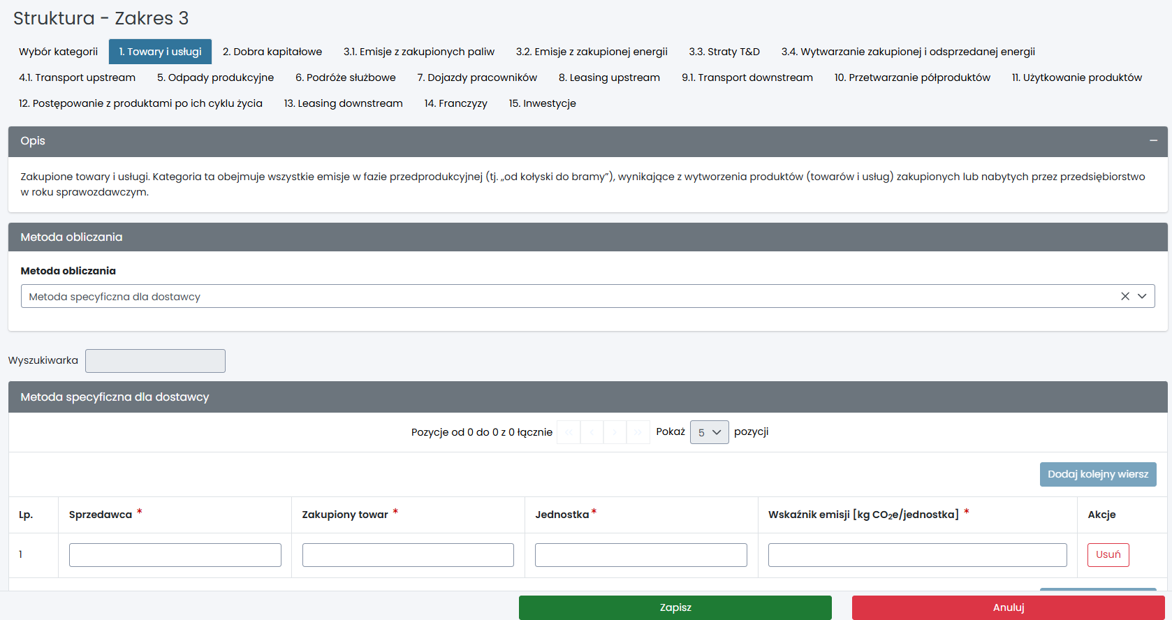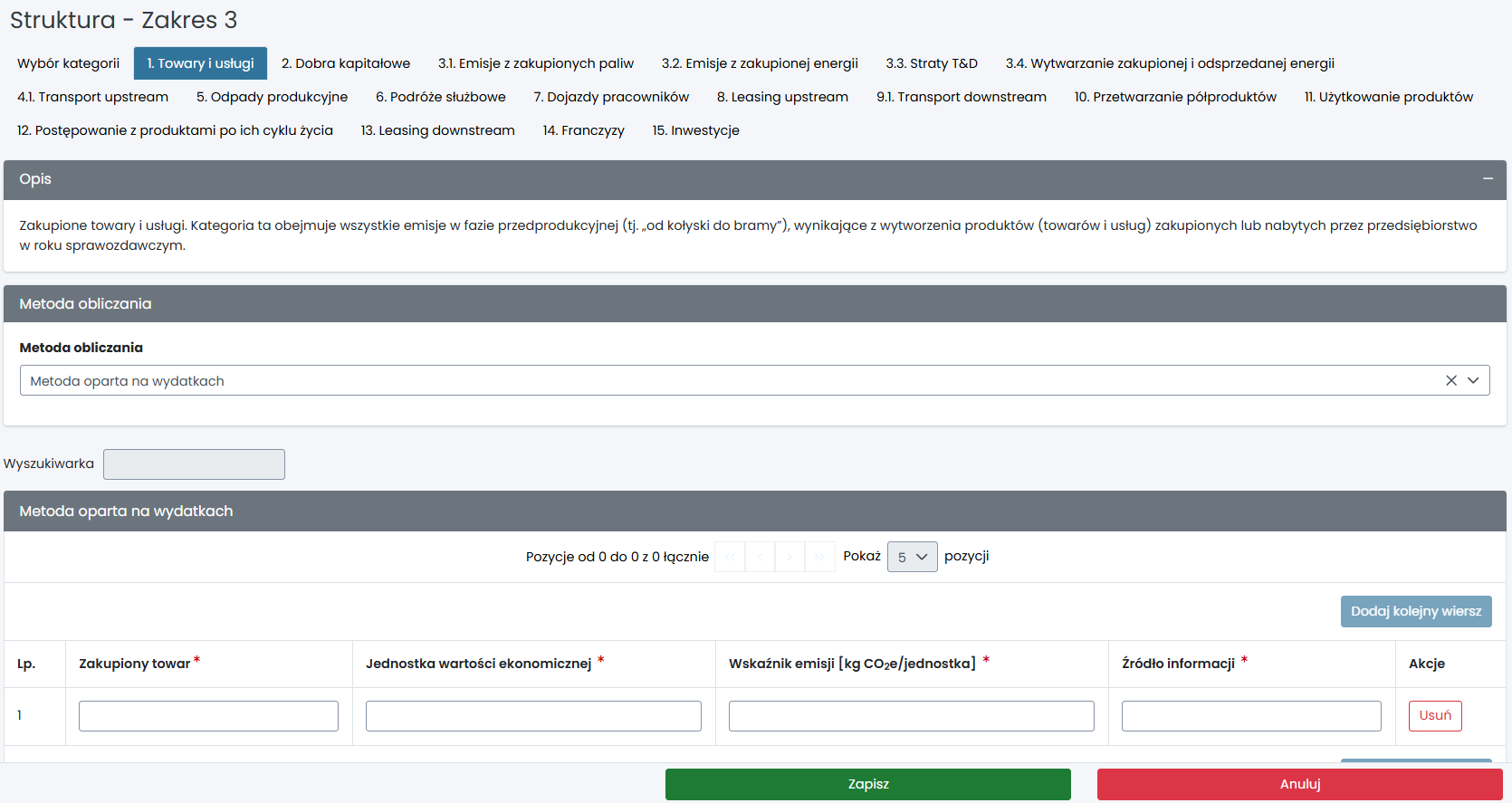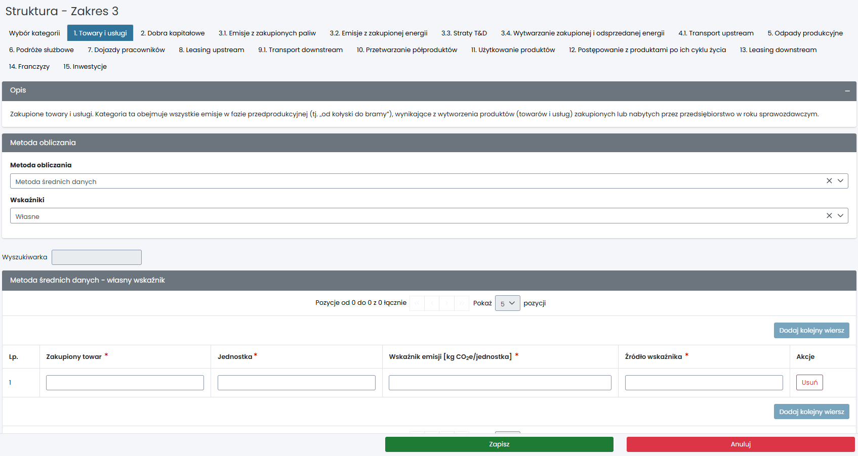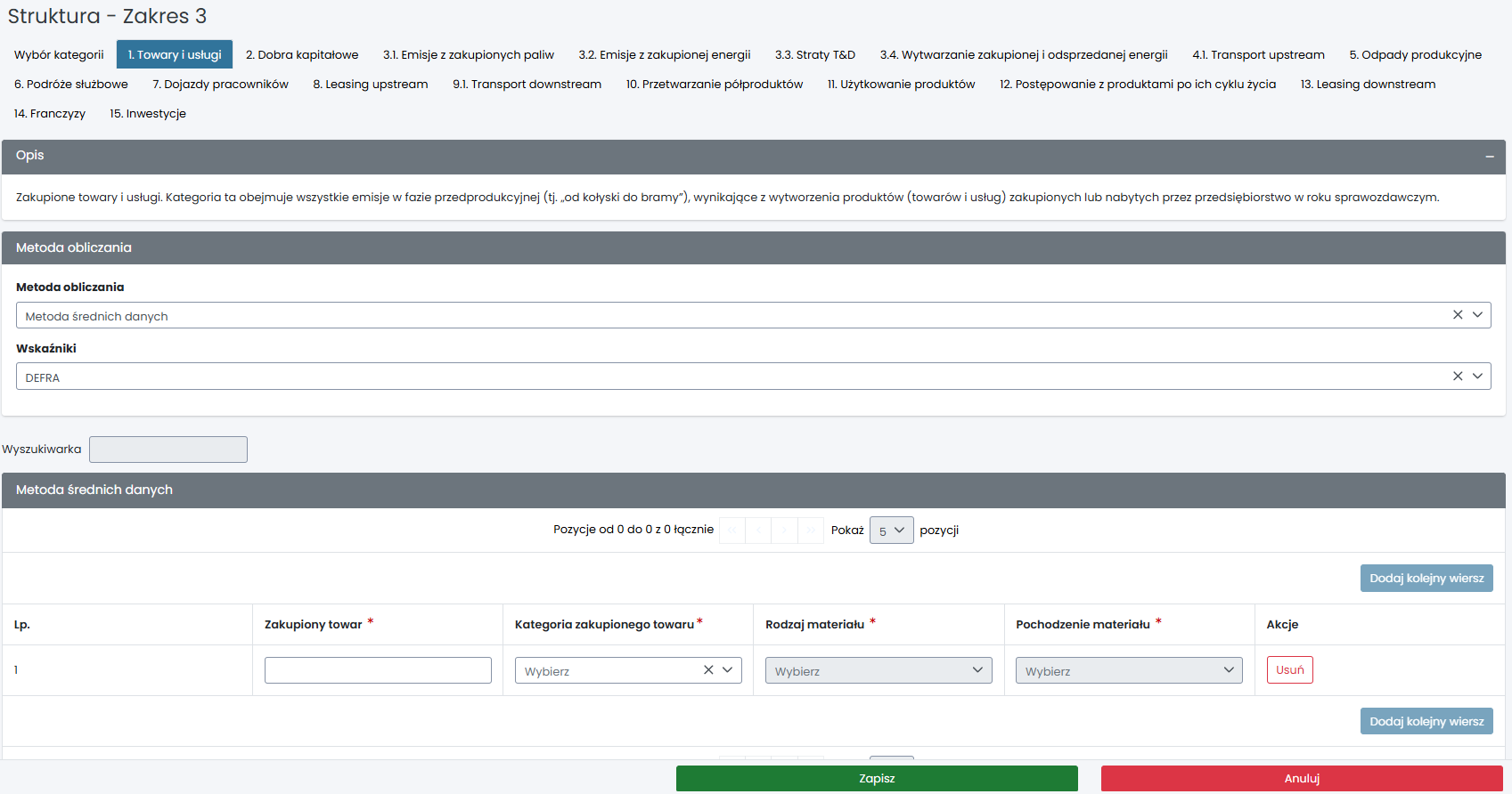 Kategorii zakupionego towaru – wybór z listy rozwijanej, gdzie pozycje zależą od wskaźników emisji dostępnych w bazie DEFRA,