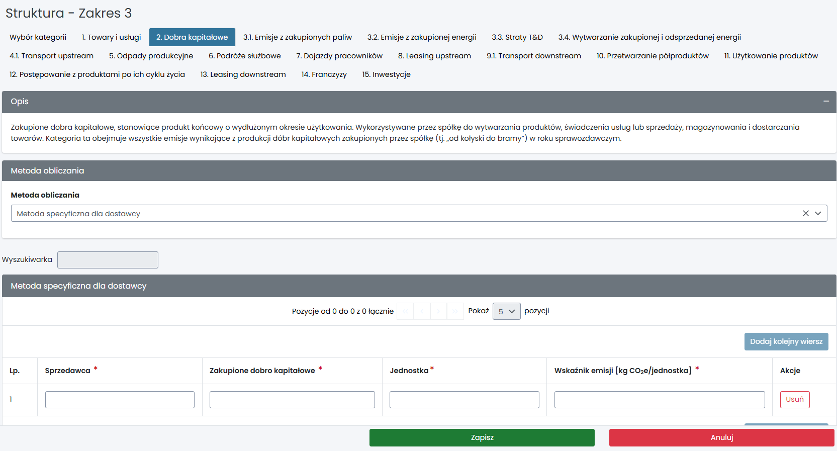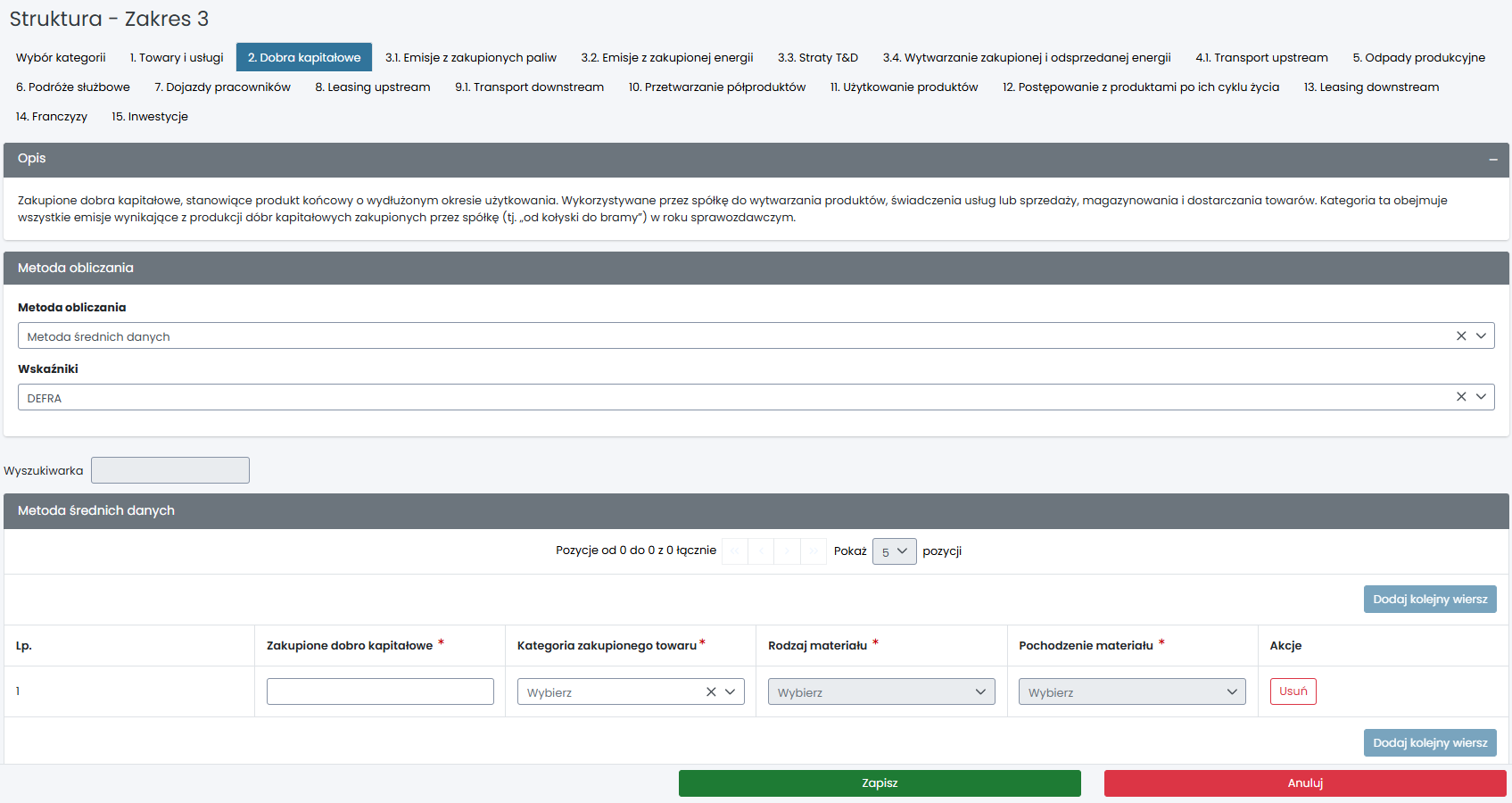 Kategorii zakupionego dobra kapitałowego – wybór z listy rozwijanej, gdzie pozycje zależą od wskaźników emisji dostępnych w bazie DEFRA,