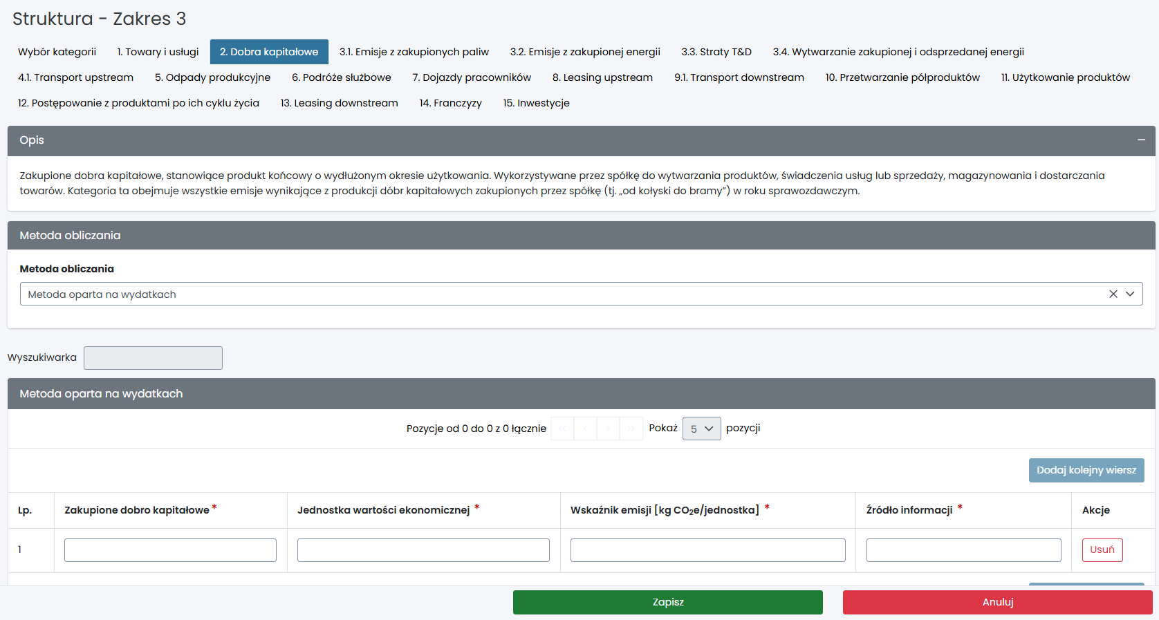 Metoda oparta na wydatkach polega na szacowaniu emisji na podstawie wartości ekonomicznej zakupionych dóbr kapitałowych. Aplikacja nie posiada wgranych wskaźników emisji dla tej metody, dlatego należy je wprowadzić samodzielnie.