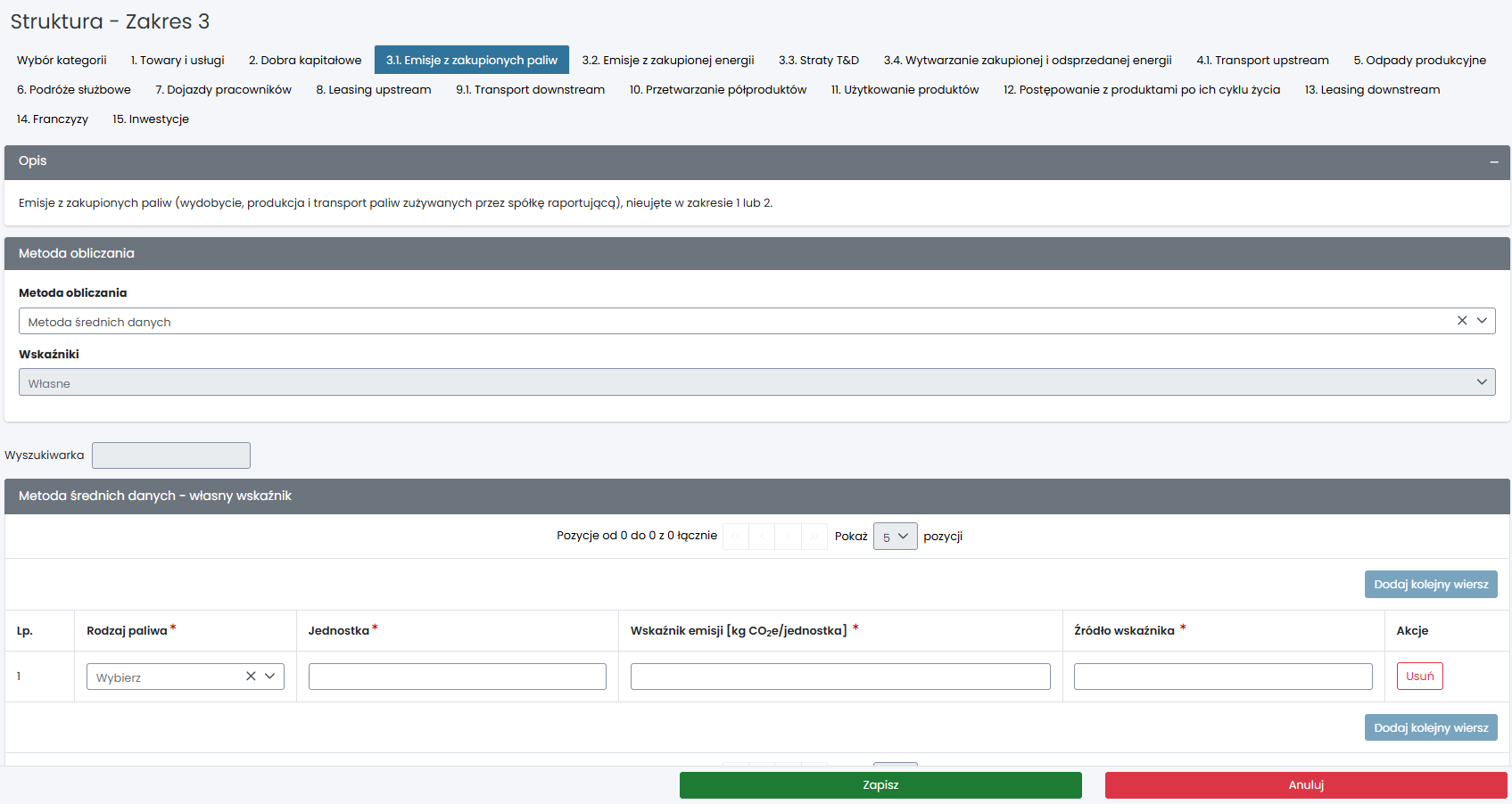 W aplikacji dla kategorii 3.1 metoda średnich danych umożliwia wprowadzenie wskaźników własnych. Natomiast, w menu „Komponent ślad węglowy” można wprowadzić dane dla wskaźników DEFRA.