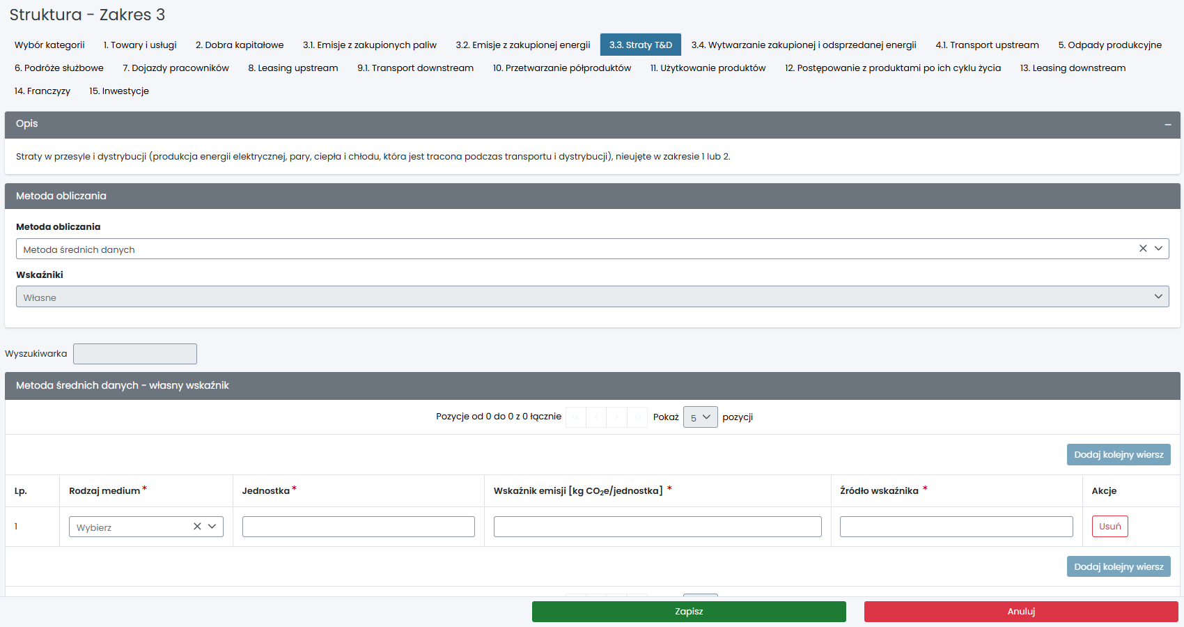 W aplikacji dla kategorii 3.3 możesz wprowadzić dane dla wskaźników własnych. Dodatkowo, w menu Komponent ślad węglowy można wprowadzić również dane dla wskaźników DEFRA.