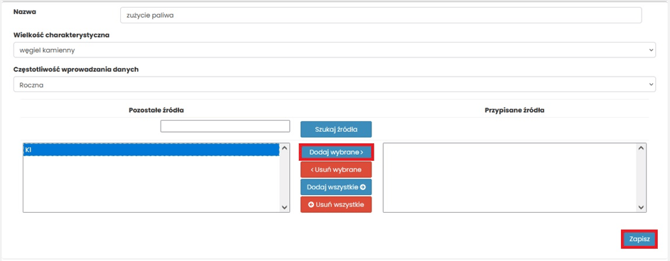 wybierz wielkość charakterystyczną (lista pochodzi z zakładki „Źródła, emitory, wielkości charakterystyczne”),