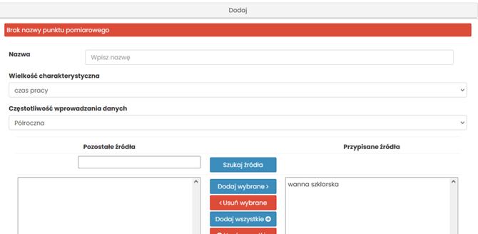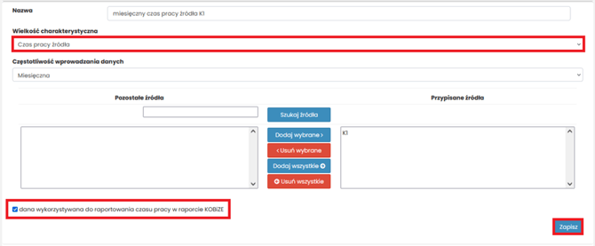 UWAGA: Jeśli jako wielkość charakterystyczną wybierzesz Czas pracy źródła, pojawi się dodatkowy element: