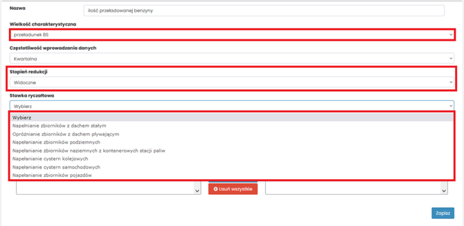 Jeśli w wielkości charakterystycznej wybierzesz przeładunek paliwa (ryczałt), pojawią się dodatkowe pola: