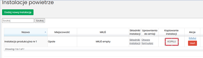 5. Po zapisaniu instalacja pojawi się w tabeli „Instalacje powietrze”.