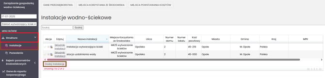 Utworzenie struktury przedsiębiorstwa to kolejny krok po uzupełnieniu podstawowych danych (Dane podmiotu, Pozwolenia). To właśnie tutaj wskazujesz, gdzie w systemie będą wpisywane wyniki pomiarów. Strukturę zakładasz raz — później edytujesz ją tylko przy zmianach w firmie (np. nowy mkzś, zmiana sposobu odprowadzania ścieków).