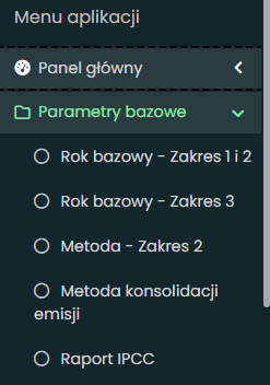 Sekcja Parametry bazowe składa się z pięciu kluczowych zakładek, dzięki którym możesz ustalić podstawowe dane dotyczące inwentaryzacji emisji. Są to: