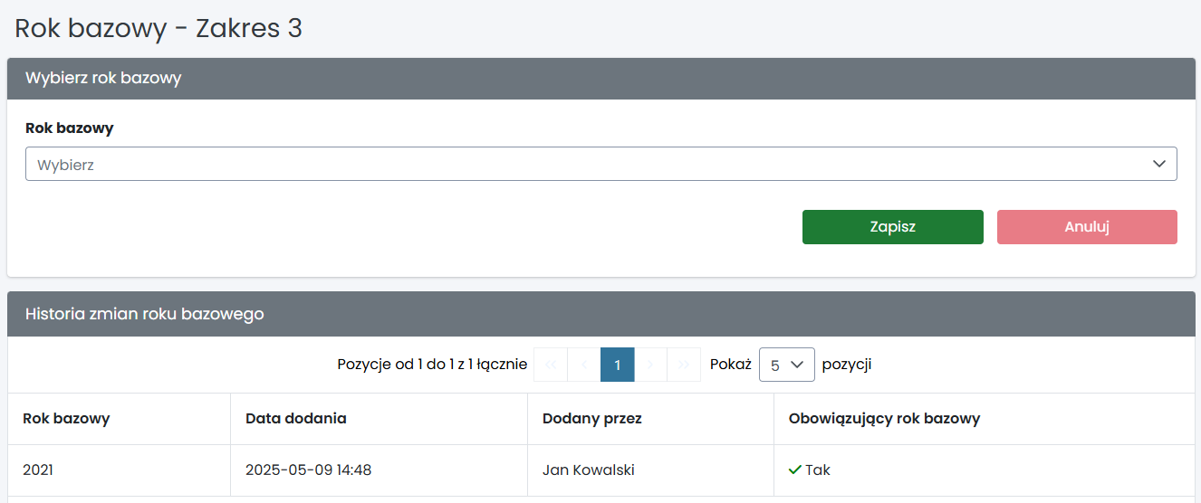 Na stronie „Rok bazowy – zakres 1 i 2” dokonasz wyboru roku bazowego dla tych dwóch zakresów. W tym celu w sekcji „Wybierz rok bazowy” wybierz z listy rozwijanej odpowiednią opcję i zatwierdź zmiany przyciskiem „Zapisz”.