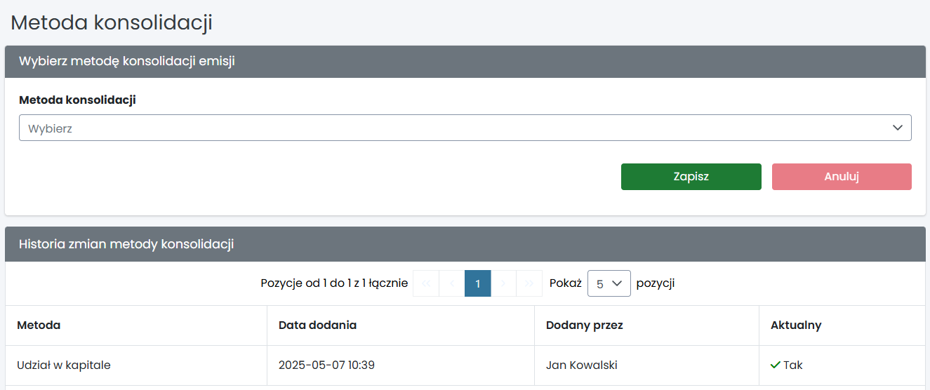 Poniżej listy rozwijanej przedstawiono historię zmian metody konsolidacji. W tabeli znajdują się informacje o dacie dokonanych zmian, loginie użytkownika, który dokonał zmiany oraz która metoda jest aktualnie wybrana.