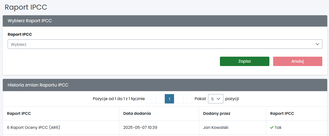Poniżej listy rozwijanej przedstawiono historię zmian. W tabeli znajdują się informacje takie jak: który Raport IPCC został wybrany, data dokonania zmiany oraz login użytkownika, który dokonał zmiany.