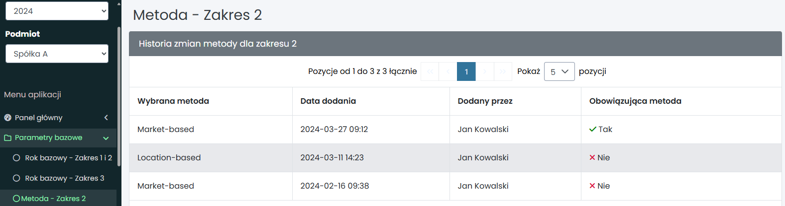 Na stronie „Metoda – Zakres 2” dokonuje się wyboru metody obliczeń emisji dla Zakresu 2. Wynik końcowy będzie zatem sumą wyniku otrzymanego wybraną metodą obliczeń i wyniku obliczeń emisji dla Zakresu 1.