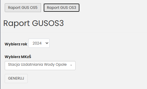 Jak Wygenerować Raporty GUS? Raporty GUS Do generowania poszczególnych raportów GUS (Główny Urząd Statystyczny) wybierz rok, instalację lub MKzŚ (miejsce korzystania ze środowiska) i kliknij przycisk “GENERUJ”. Raport GUS OS5 Raport GUS OS3