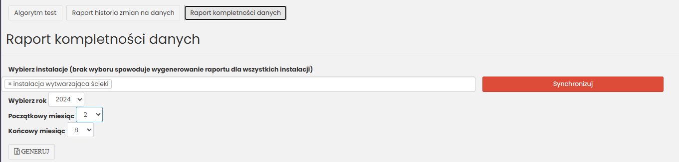 Raport kompletności danych - pomaga zlokalizować braki w danych do wprowadzenia i ma za zadanie przedstawić czy dla każdej definicji algorytmu wprowadzono wszystkie punkty pomiarowe oraz weryfikować czy wartości liczbowe zostały wprowadzone.