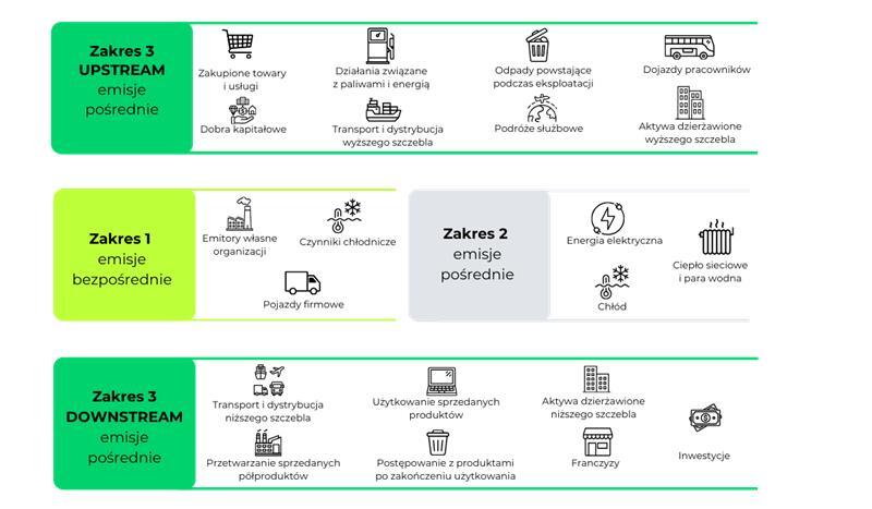 Zakres 3 - emisje pośrednie gazów cieplarnianych, powstające na wcześniejszym i późniejszym etapie łańcucha wartości, obejmujące emisje wyższego szczebla (upstream) oraz emisje niższego szczebla (downstream), ujęte w 15 kategoriach.