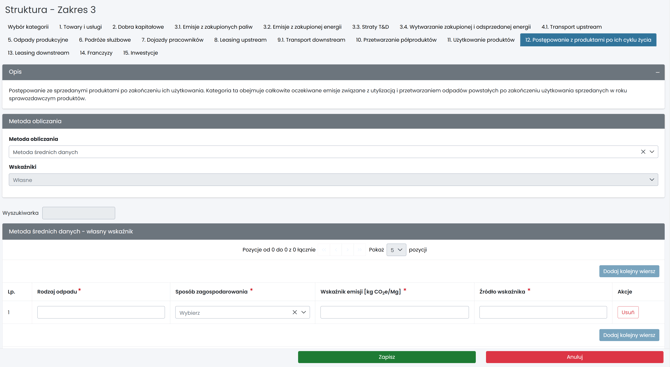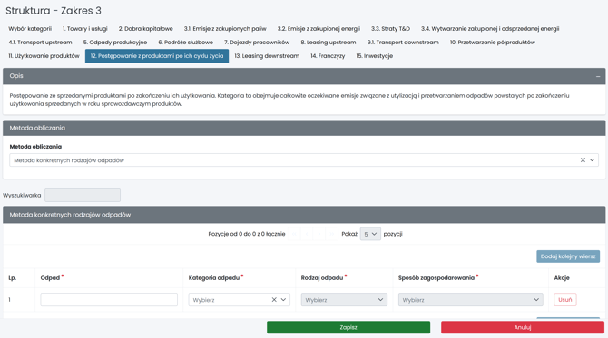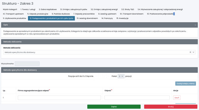 Kategoria obejmuje emisje związane z utylizacją i przetwarzaniem odpadów powstających po zakończeniu użytkowania produktów sprzedanych w roku sprawozdawczym.