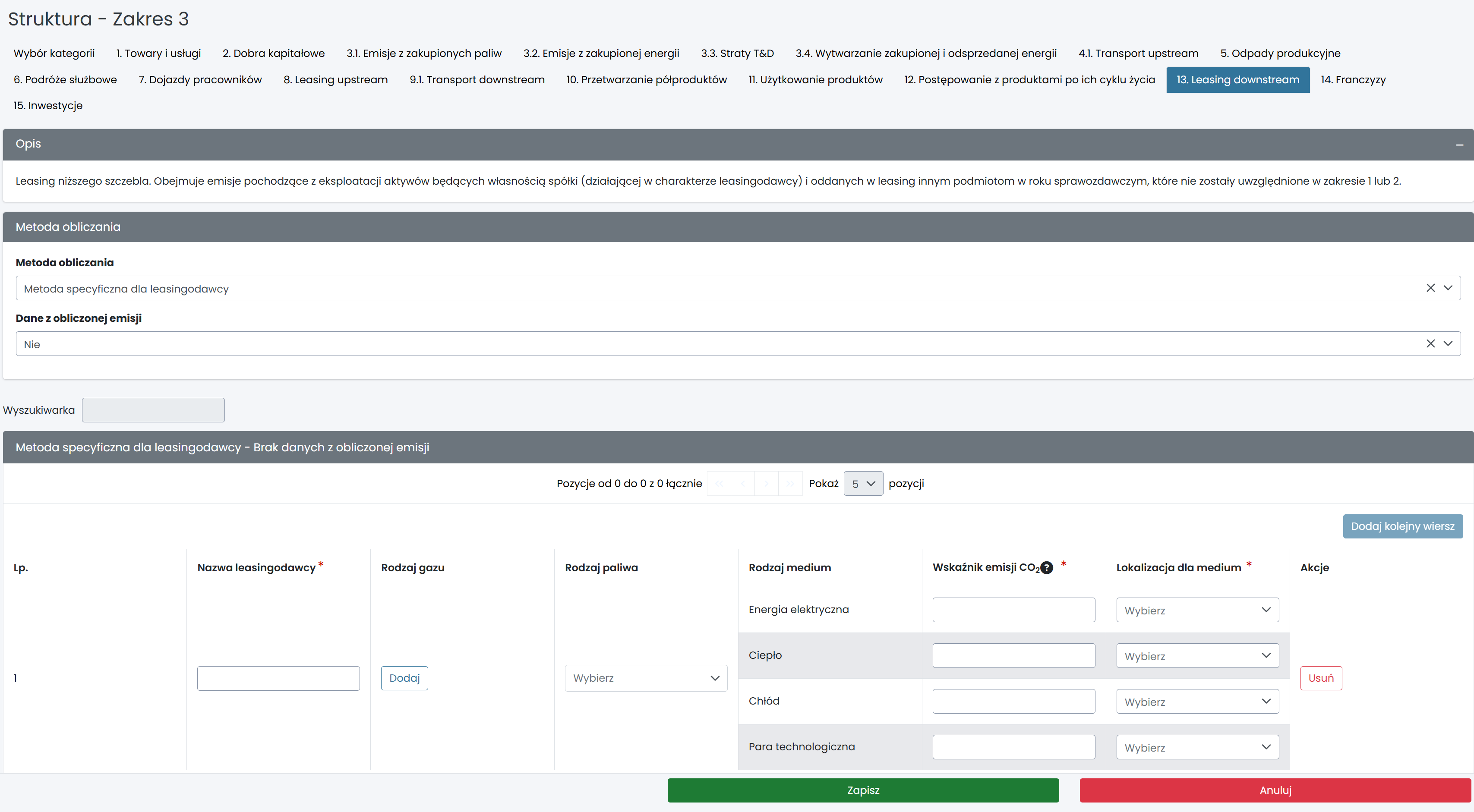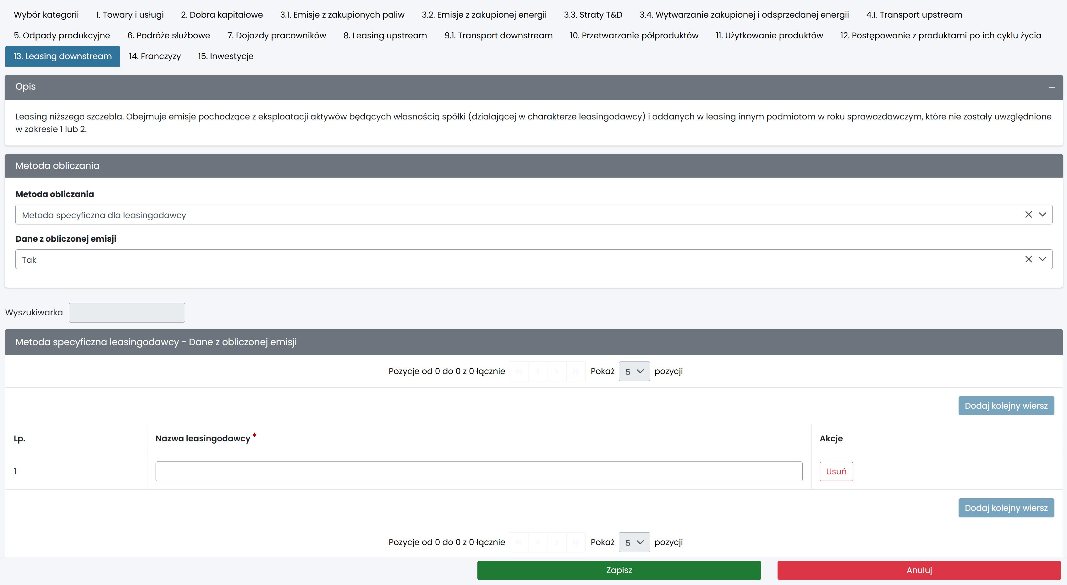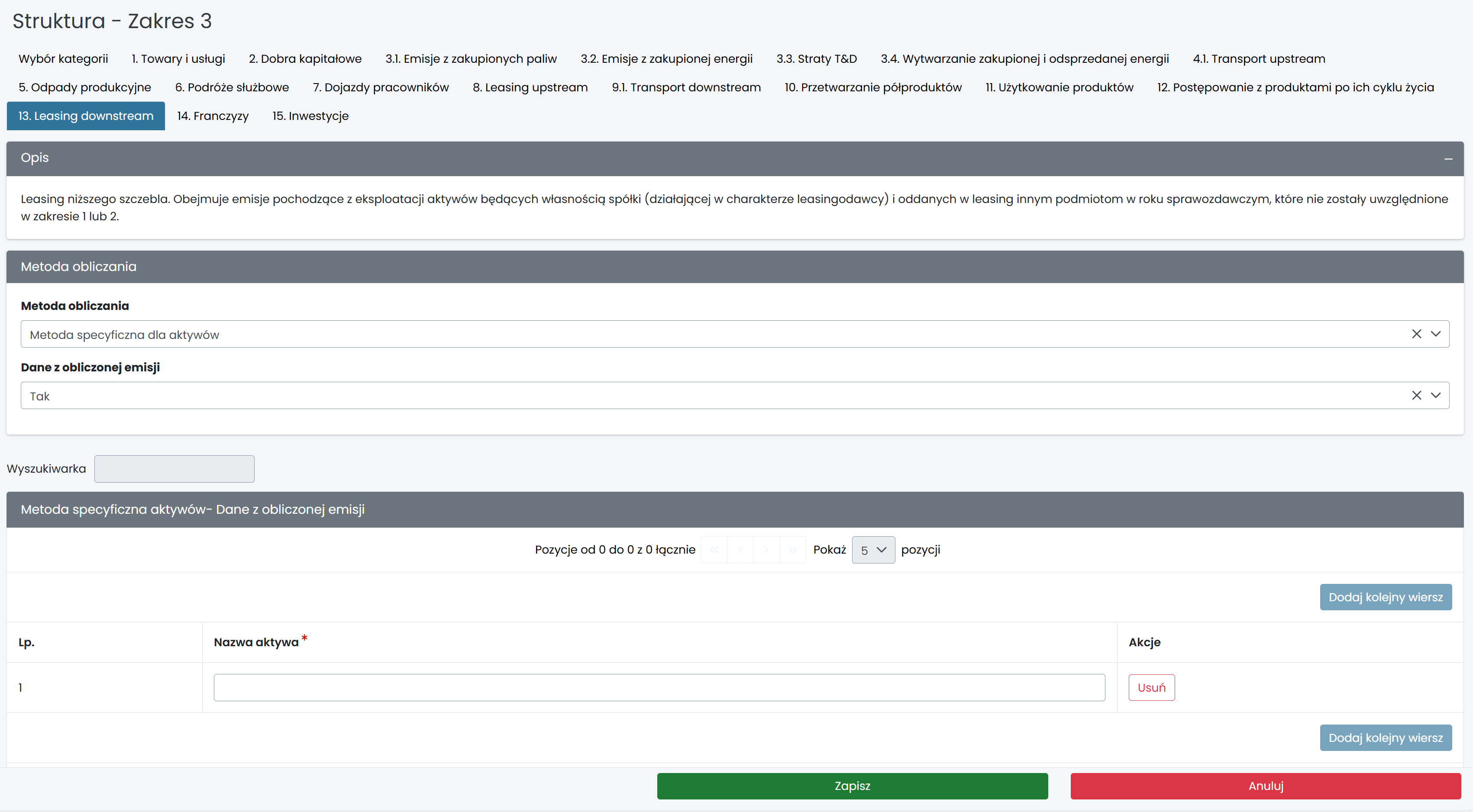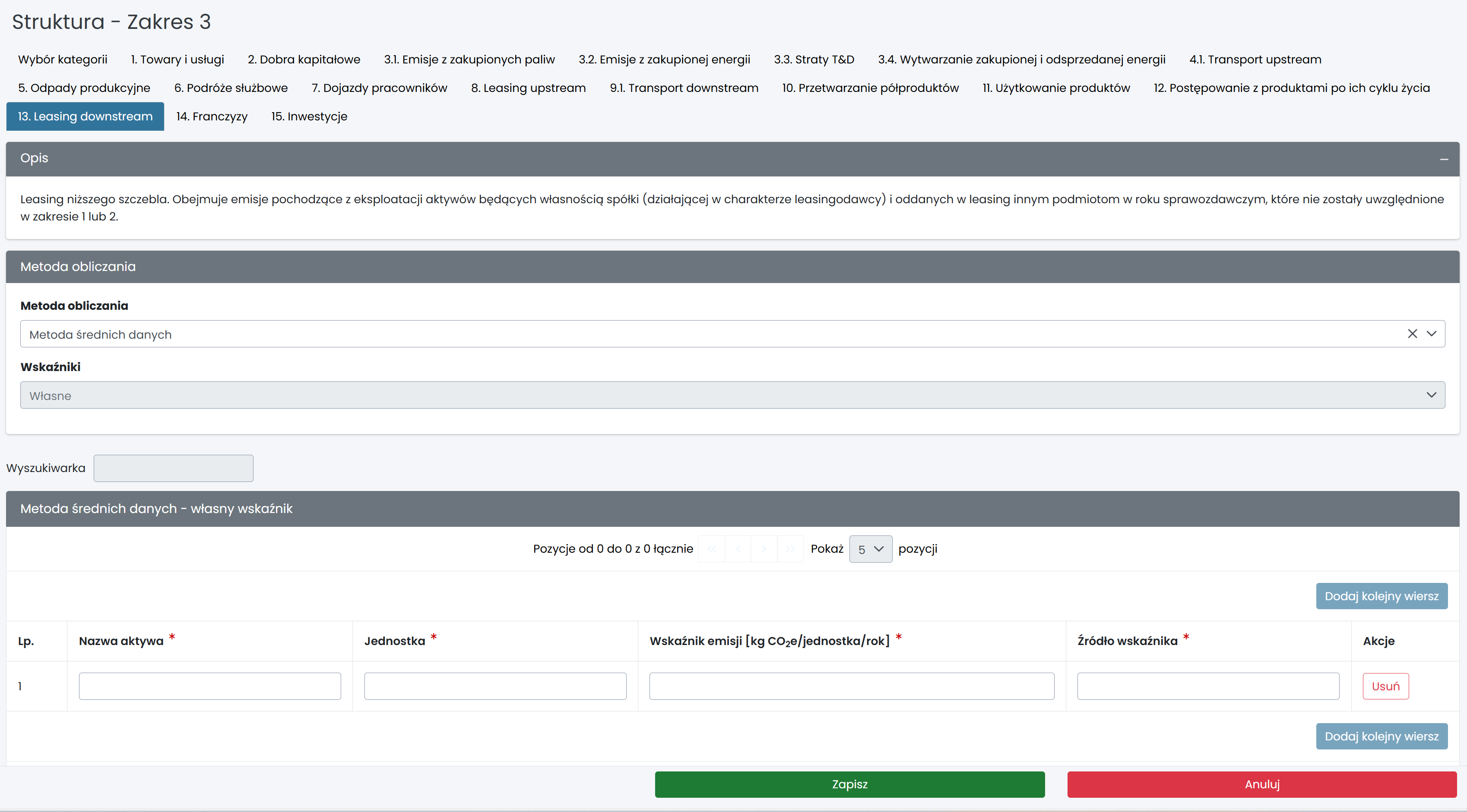 Metoda polega na oszacowaniu emisji dla każdego przedmiotu leasingu na podstawie danych statystycznych lub wtórnych. Aplikacja nie posiada wgranych wskaźników dla tej metody – należy wprowadzić je samodzielnie.