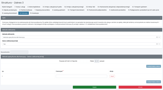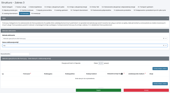 W polu „Dane z obliczonej emisji” wybierz „Tak” i uzupełnij wyłącznie nazwę franczyzy w polu „Franczyza”.