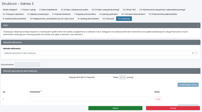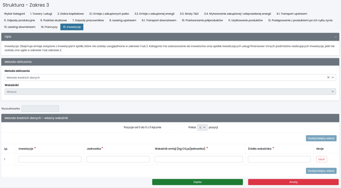 Ta kategoria obejmuje emisje związane z inwestycjami spółki, które nie zostały ujęte w zakresie 1 lub 2. Dotyczy to inwestorów oraz spółek świadczących usługi finansowe lub innych podmiotów realizujących inwestycje - pod warunkiem, że nie należą do zakresu 1 lub 2.