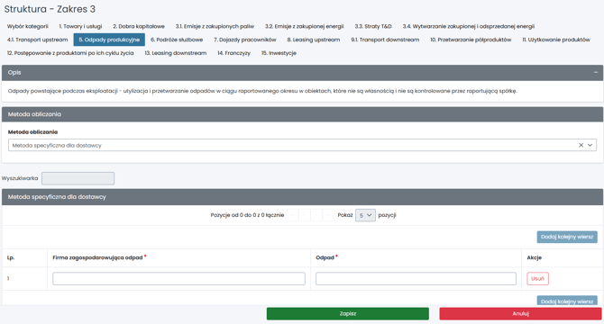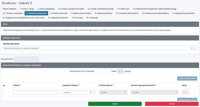 Kategoria odpadu – wybór z listy rozwijanej (pozycje zależne od wskaźników emisji z bazy DEFRA),