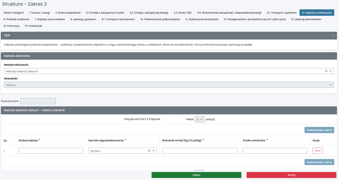Sposób zagospodarowania – wybór z listy rozwijanej (pozycje zależne od wskaźników emisji z bazy DEFRA).