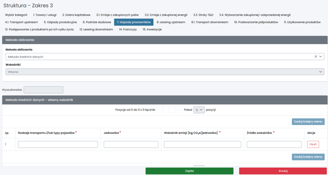 W kategorii 7 strukturę można zbudować w oparciu o metodę średnich danych z wykorzystaniem własnych wskaźników. Dodatkowo, na stronie “Komponent ślad węglowy” istnieje możliwość wprowadzania danych metodą średnich danych dla wskaźników DEFRA, metodą opartą na paliwie oraz metodą opartą na odległości.