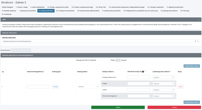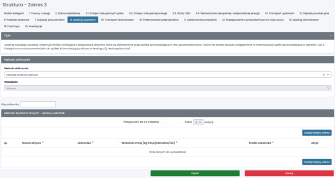 Kategoria obejmuje emisje wynikające z eksploatacji aktywów dzierżawionych przez spółkę w roku sprawozdawczym, które nie zostały uwzględnione w zakresie 1 lub 2. Dotyczy wyłącznie leasingobiorców.