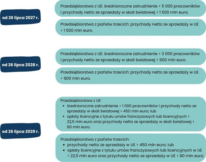 Dyrektywa CSDD ma zastosowanie do największych przedsiębiorstw z UE oraz państw trzecich, spełniających określone kryteria finansowe i średniorocznego zatrudnienia w każdym z ostatnich dwóch kolejnych lat obrotowych. Wymogi CSDDD będą obowiązywać zgodnie z 3-etapowym harmonogramem rozpoczynającym się 26 lipca 2027 r.