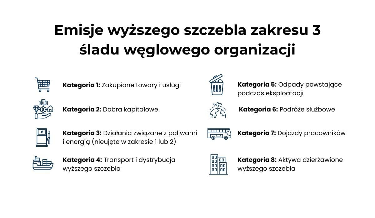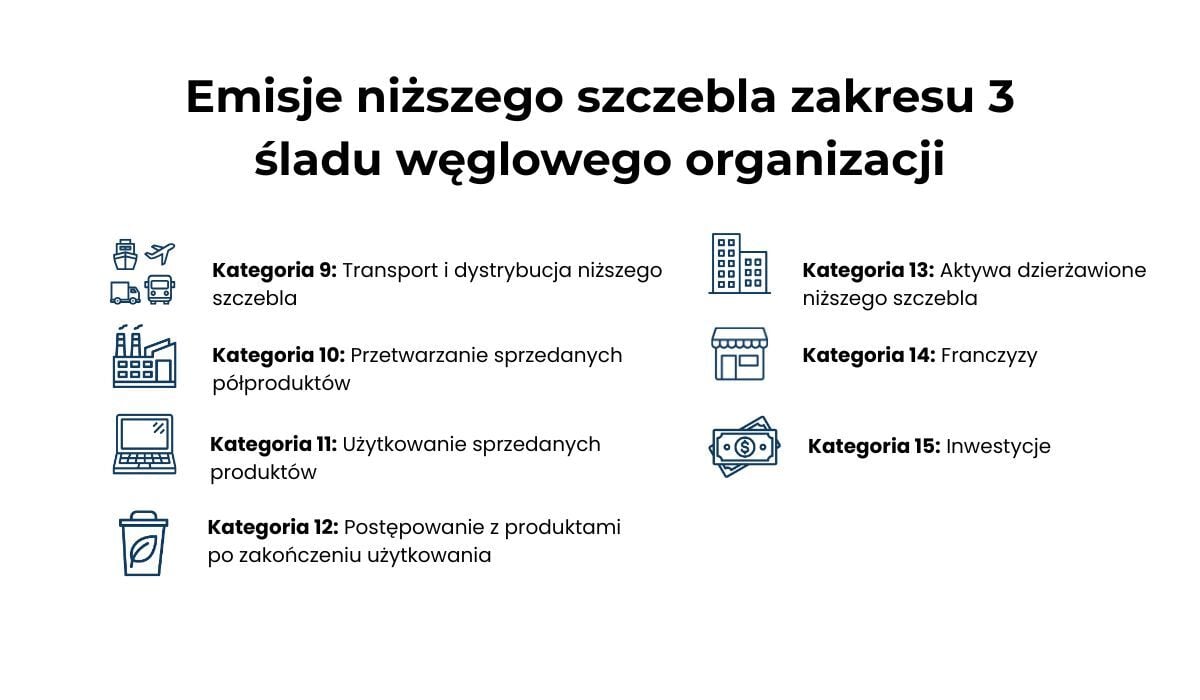 Więcej informacji na temat 15 kategorii zakresu 3 wraz z przykładami danych wtórnych, znajdziesz w artykule pt. Charakterystyka 15 kategorii zakresu 3 śladu węglowego organizacji.