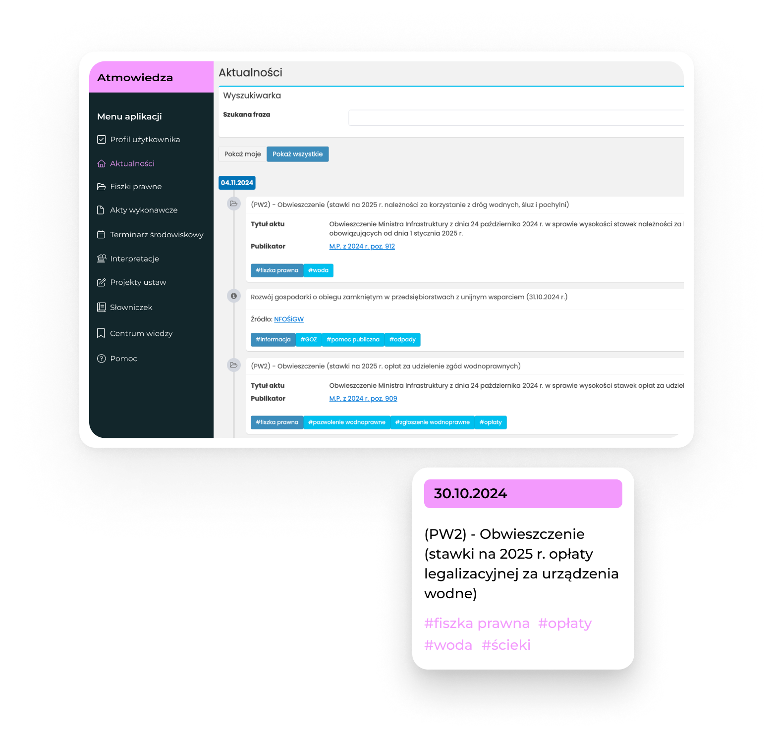 Przeglądając regularnie treści publikowane w serwisie Atmowiedza będziesz na bieżąco z aktualnymi informacjami oraz z planowanymi zmianami prawnymi w ochronie środowiska. Będziesz wiedzieć, kiedy i jaki obowiązek środowiskowy należy spełnić oraz poznasz planowane zmiany prawa, które dotyczą Twojego przedsiębiorstwa.