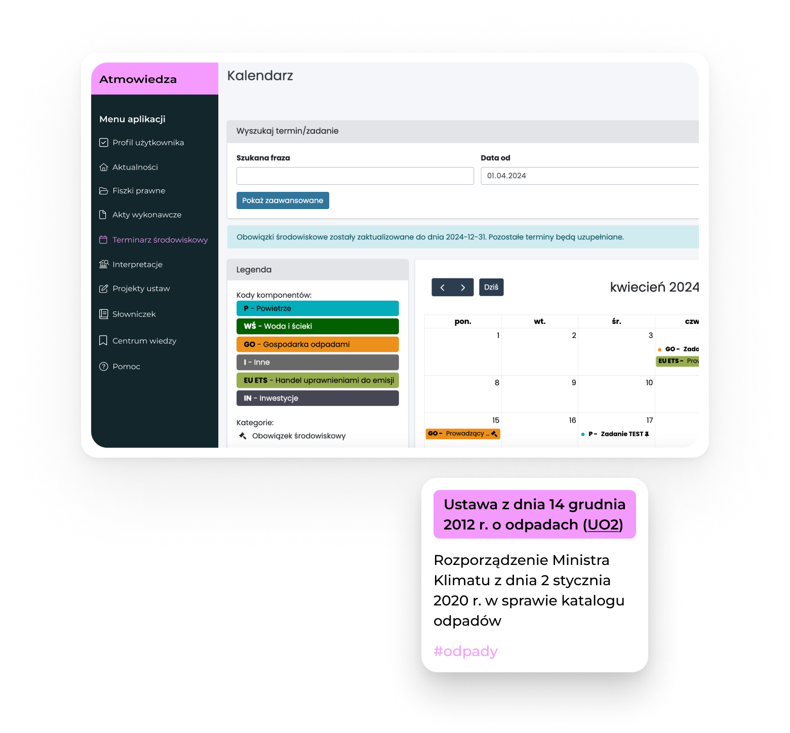 Podręczny kalendarz zawierający informacje o terminie i sposobie realizacji nowych oraz cyklicznych obowiązków środowiskowych przedsiębiorstwa, wynikających z przepisów prawa.