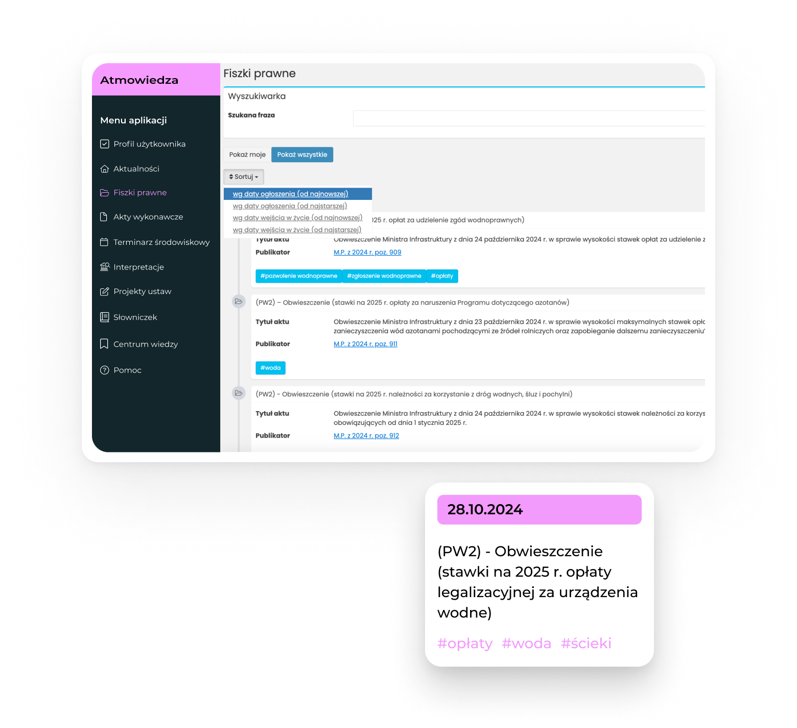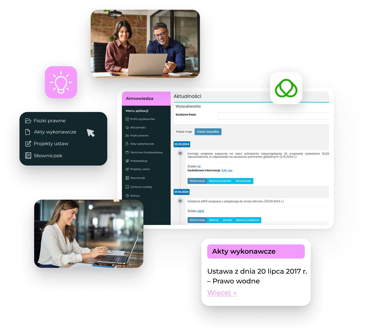Serwis prawny Atmowiedza jest dostępny w przeglądarce, co pozwala na korzystanie z niego z dowolnego miejsca i urządzenia z dostępem do internetu. Ułatwi Ci on pracę w dziale ochrony środowiska przedsiębiorstwa. Dzięki bieżącym aktualnościom i aktualizacjom pod kątem zmian prawnych, nie ominie Cię żadna nowa informacja branżowa.