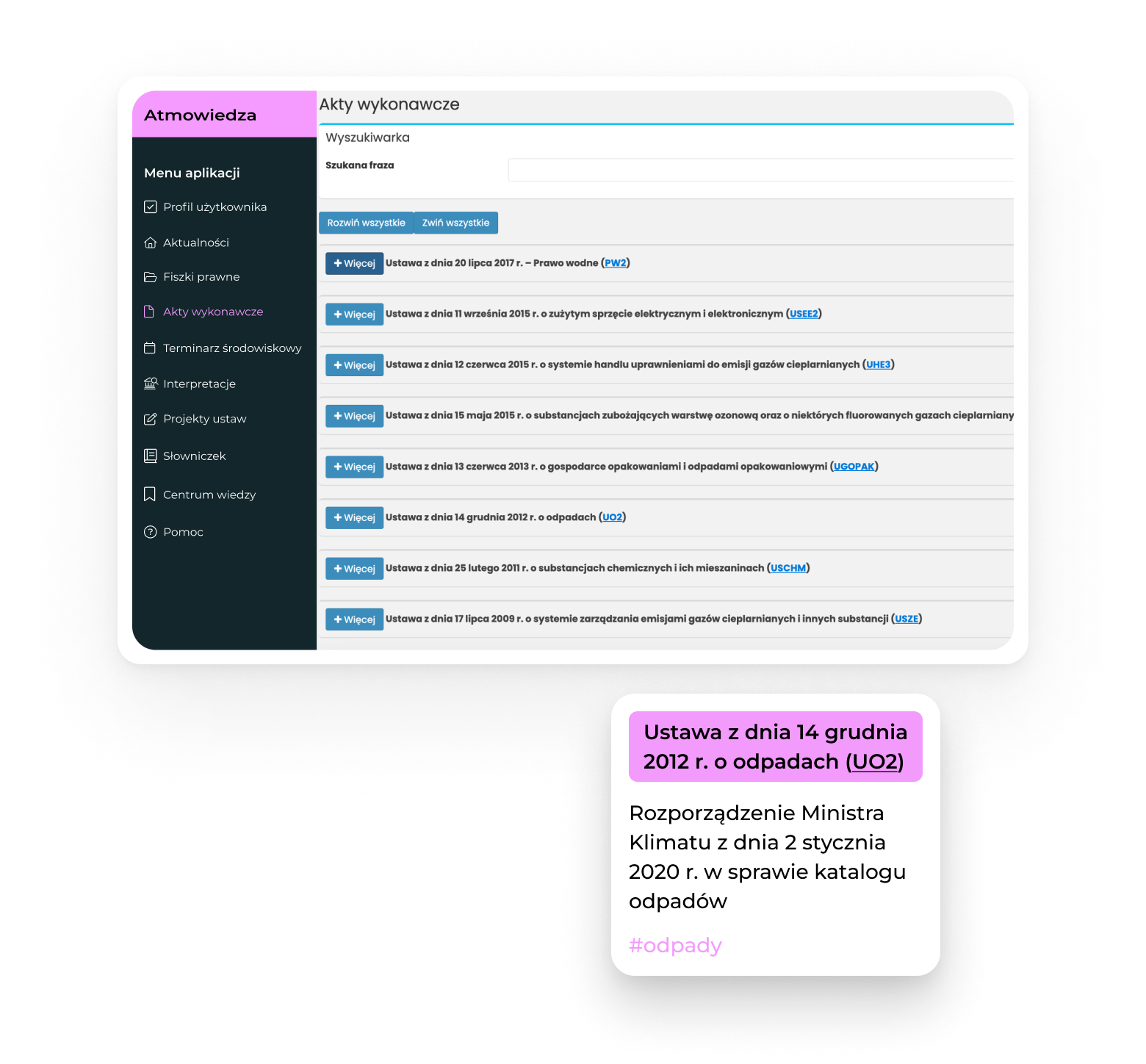 Zbierane od wielu lat interpretacje przepisów prawnych (m.in. z Ministerstwa Klimatu i Środowiska, Bazy danych o produktach i opakowaniach oraz o gospodarce odpadami, EUR-Lex, Generalnej Dyrekcji Ochrony Środowiska, wyroki: Naczelnego Sądu Administracyjnego, wojewódzkiego sądu administracyjnego oraz Trybunału Konstytucyjnego), a także odpowiedzi na interpelacje poselskie, wyjaśniające przepisy prawa w ochronie środowiska.