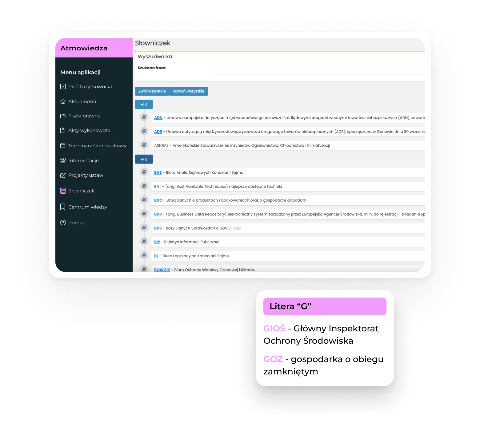 Zawiera wyjaśnienia haseł używanych w serwisie prawnym Atmowiedza, wraz z linkami do stron źródłowych.