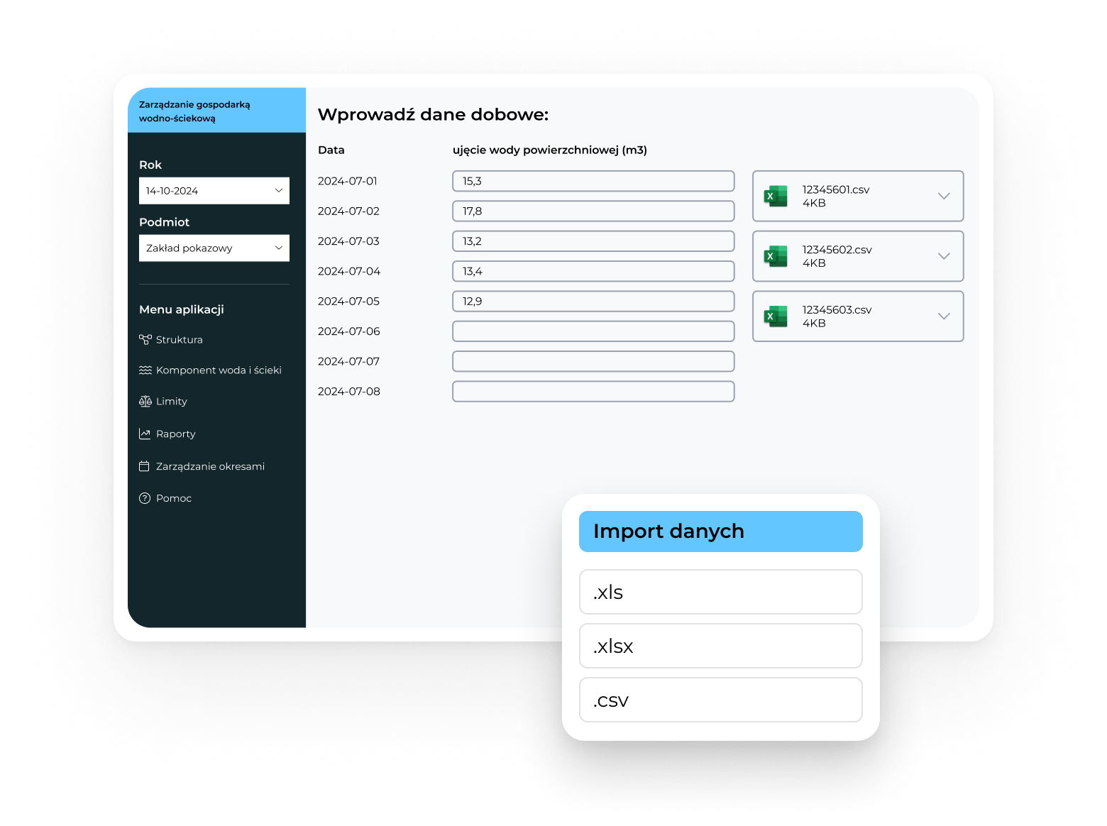 Możesz importować do aplikacji Zarządzanie gospodarką wodno-ściekową dane z plików w formacie *.xls, *.xlsx czy *.csv, dzięki czemu zniwelujesz ryzyko popełnienia błędu w trakcie ręcznego wprowadzania danych.