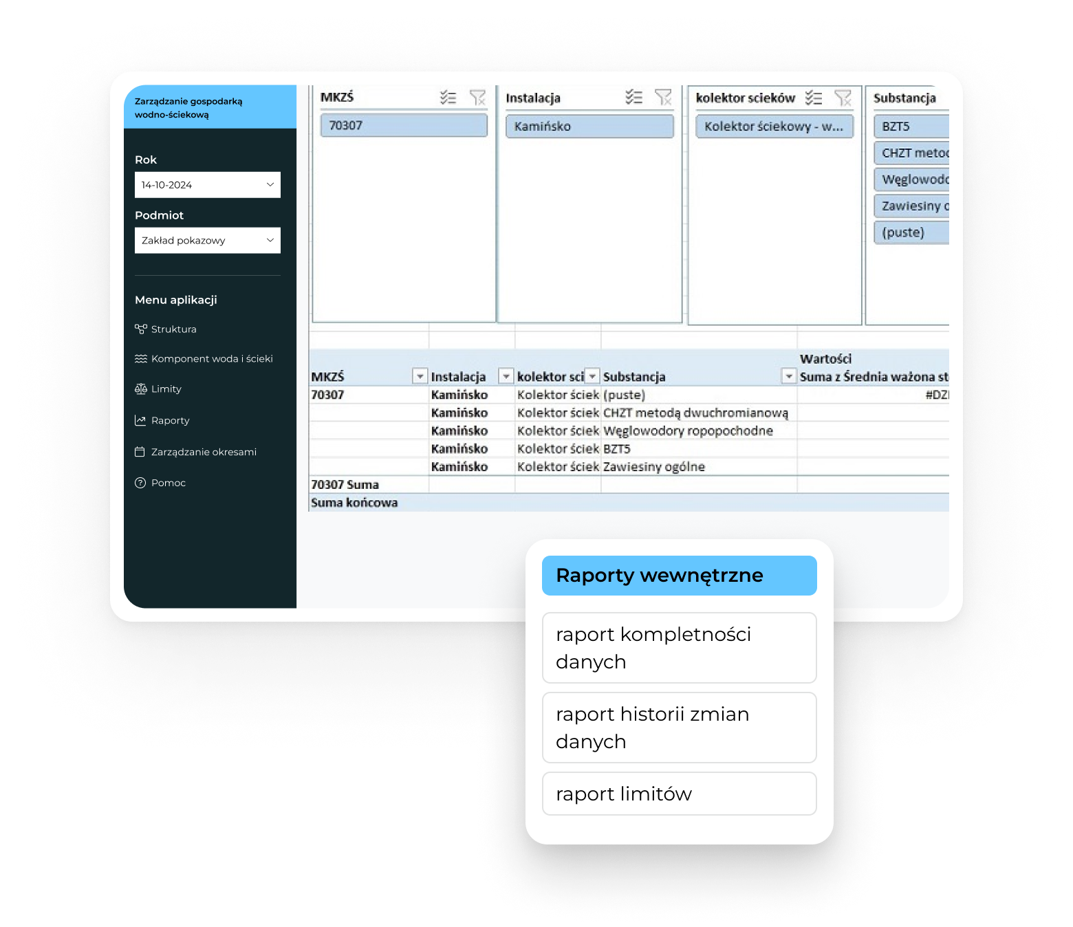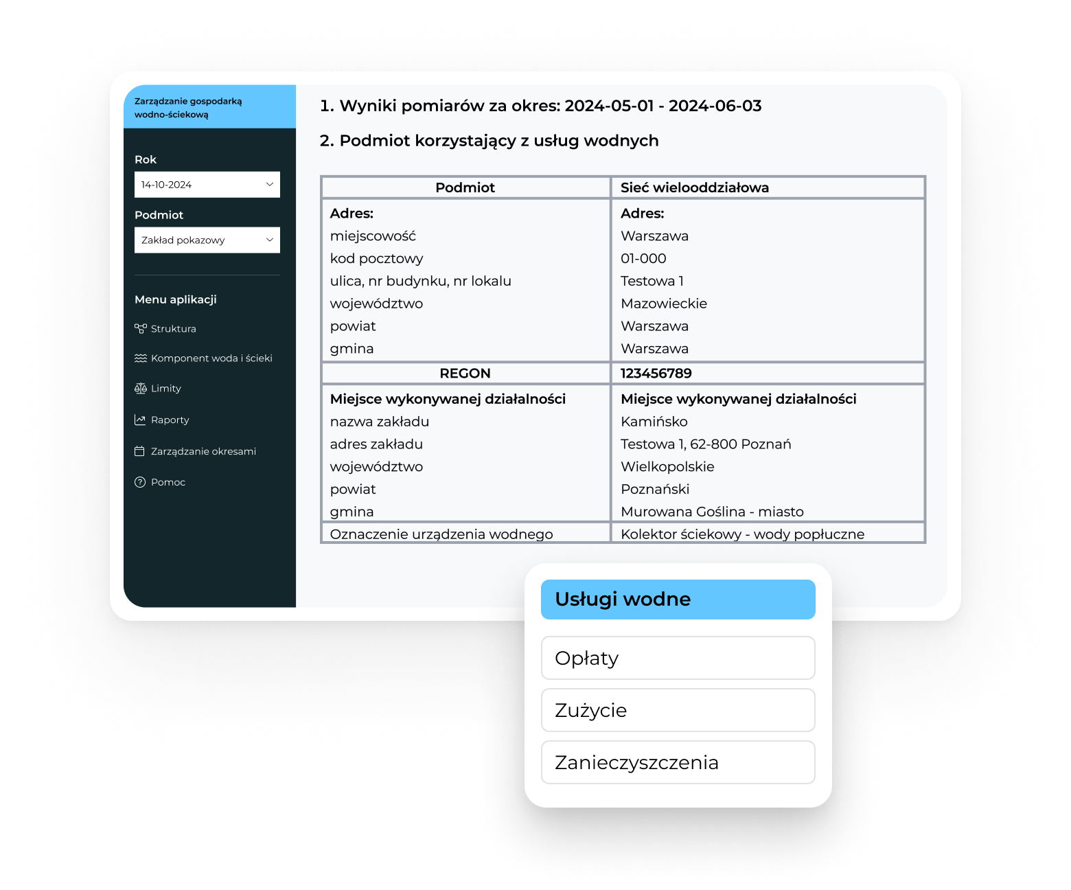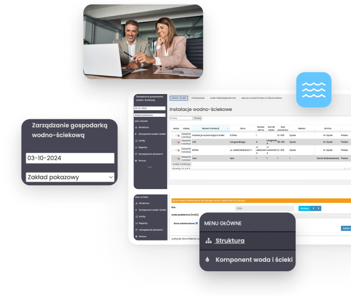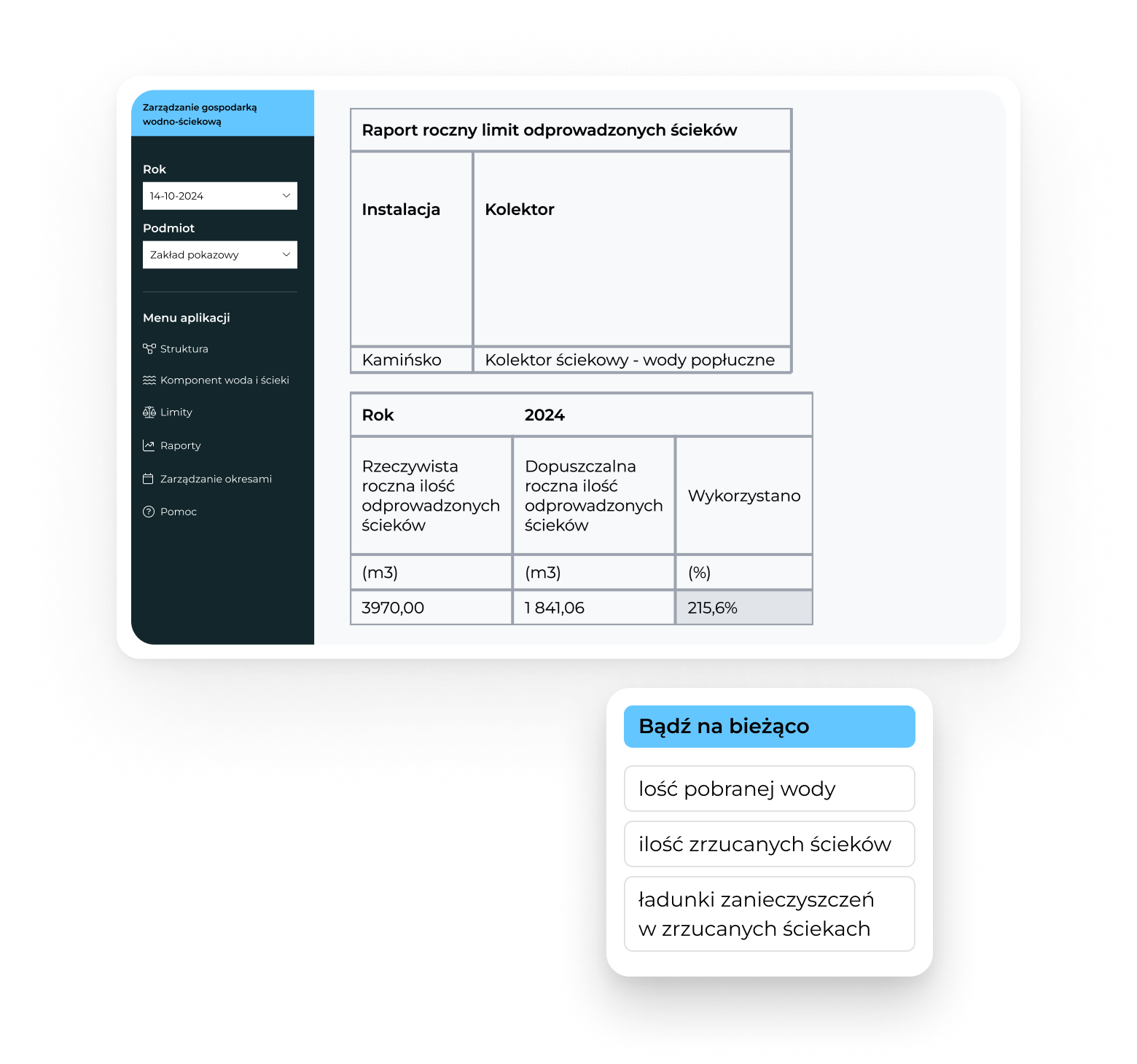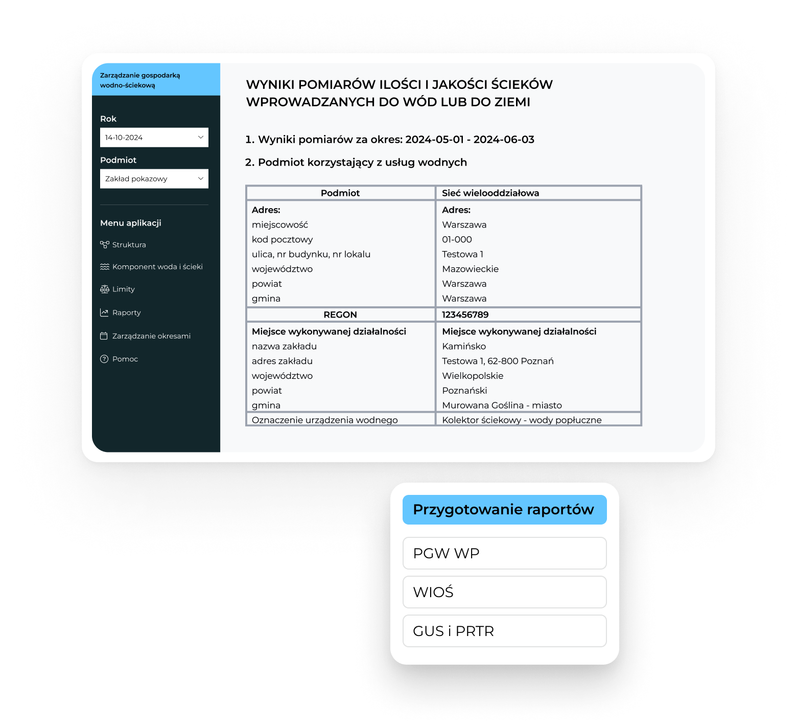 Usprawnij przygotowanie raportów wymaganych przez prawo: oświadczenia do Państwowego Gospodarstwa Wodnego Wody Polskie (PGW WP), raporty dotyczące ilości pobieranej wody i jakości ścieków do WIOŚ, dokumenty do zarządu zlewni, do Głównego Urzędu Statystycznego (GUS) i PRTR.